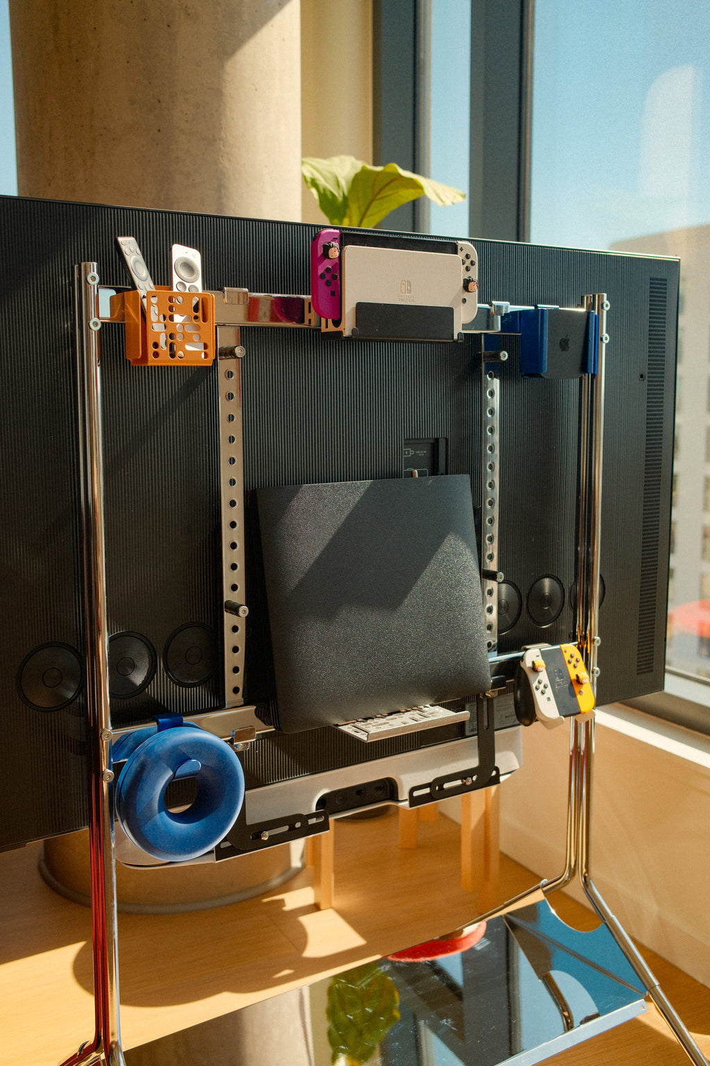 Può essere posizionato direttamente sullo stand — completamente indipendente dai fori VESA — ed è compatibile con quasi tutte le soundbar.